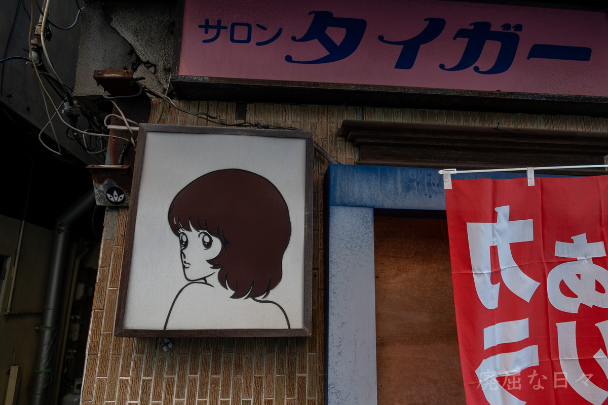にょいーんと伸びた庇のテント。紫色が妖艶で素敵。南ちゃんのサロンタイガーは廃業しているが隣のスナックパーティーは現役だった。